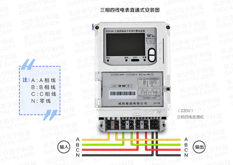 說完了第一種經(jīng)互感器的接線方式,現(xiàn)在我們來說說第二種,三相電表直通式接線圖吧,以威勝DTSY341電子式預(yù)付費(fèi)電能表為例,依照電表顯示屏下方的配置面板上所示接線圖,三相四線電表直通式接線的直觀圖應(yīng)如下圖: